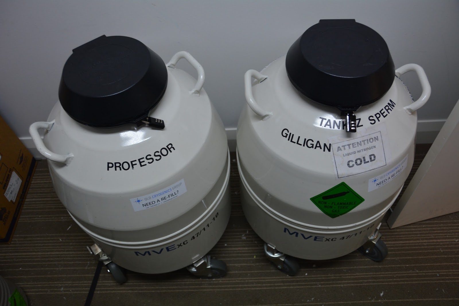 Containers of liquid nitrogen hold frozen sperm.