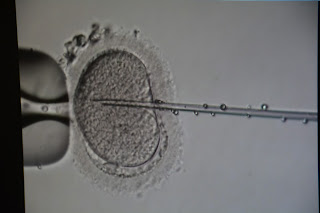 ICSI that was filmed earlier in the day. The individual sperm in the pitot tube being implanted into the egg can be seen as the black speck in the centre of the tube.